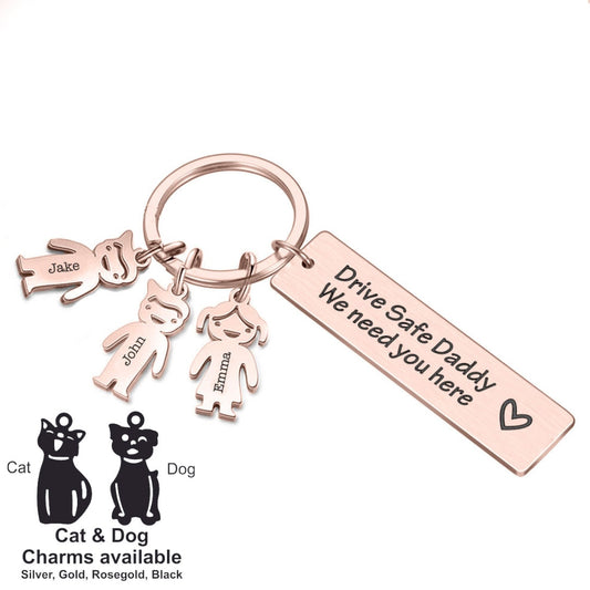 Personalised Engraved Rectangle Metal Keyring Gift With Figure Charms | Drive Safe