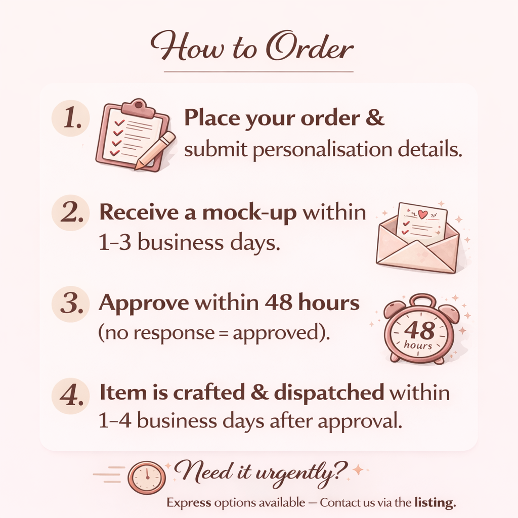 Delivery: Once the order is placed, we will need at least 2 working days to design and submit the artwork for review. Free shipping (Australia Post Letter or Parcel), if included, only applies to standard shipping within Australia. Express shipping is optional and can be selected at an extra charge during checkout. If you have any questions or need to discuss delivery times, especially if you're in a hurry, please contact us before placing your order.